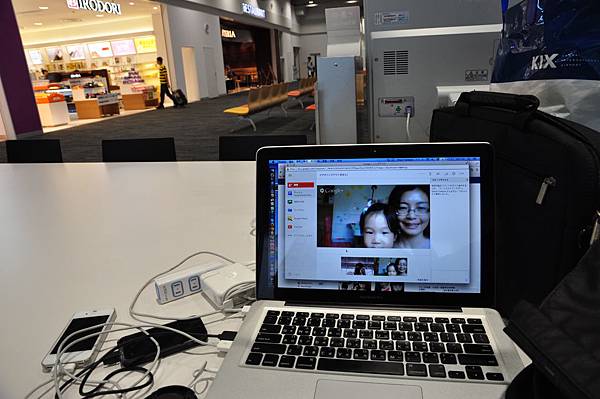 筆者於候機室的電腦桌,利用機場的免費wifi與姊姊及外甥女視訊,順便幫手機充電。