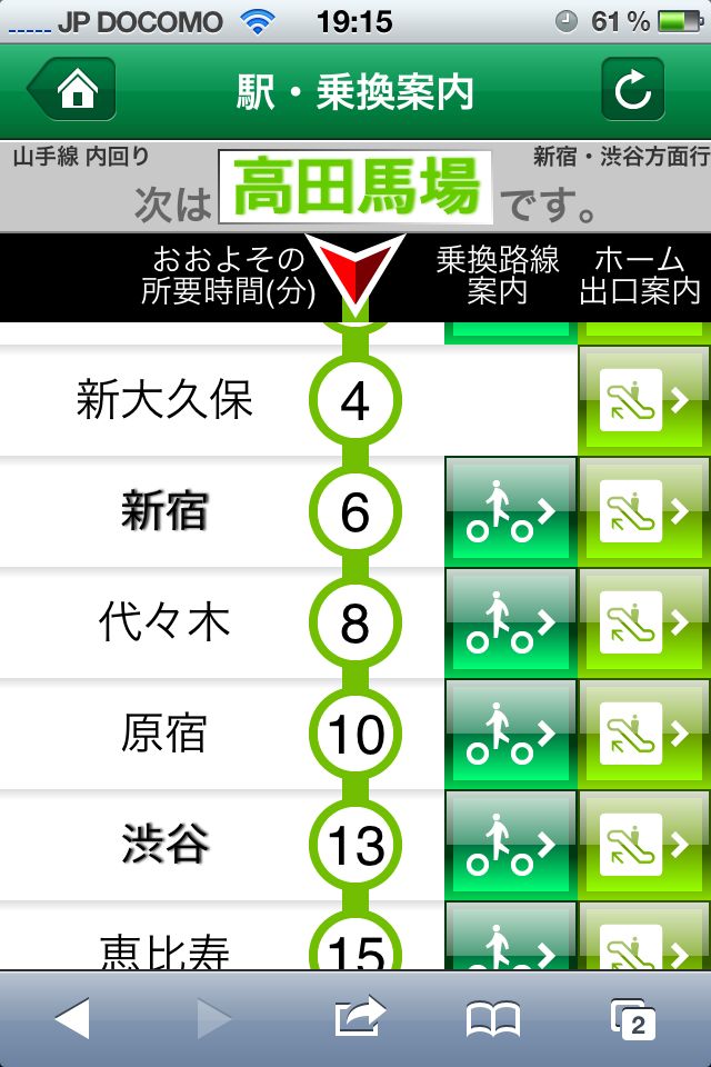 這是車站與轉乘資訊。除了和車門上的LCD螢幕一樣提供到站預計時間外,還可以點選各站的轉乘路線,及車站的階梯、電梯與出口配置。轉乘資訊同時也提供JR其他路線的站別時刻表。
