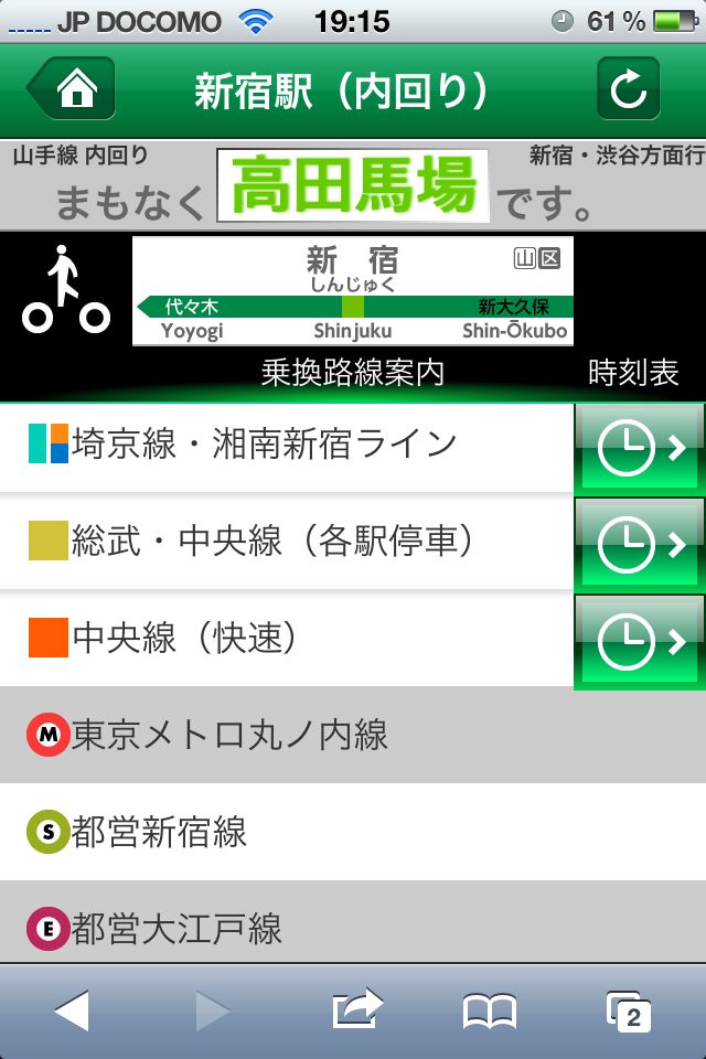 這是車站與轉乘資訊。除了和車門上的LCD螢幕一樣提供到站預計時間外,還可以點選各站的轉乘路線,及車站的階梯、電梯與出口配置。轉乘資訊同時也提供JR其他路線的站別時刻表。